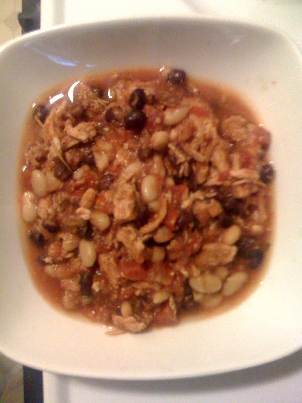 Place chicken at the bottom of a crock pot, dump all the other ingedients on top of it, set the temperature to ‘Low’ and cover. Watch five hours of NCAA basketball, stirring the chili at each halftime and game-end. After the five hours, you should be able to pull the chicken apart in to bite-sized pieces. After about seven hours the chili should be ready to shovel in to your gullet.