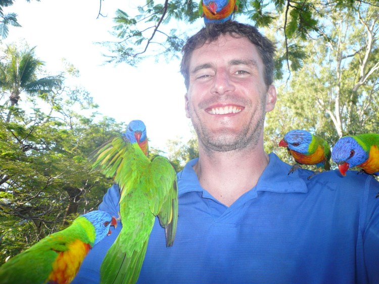 The hostel I stayed at on Magnetic Island, just off the coast from Townsville in Queensland, was wonderful and doubled as an animal reserve. Every day at 5pm, they would lug out a big bucket of Lorikeet feed and place it on the ground. 100s of wild Lorikeets would then swarm the food, freaking out and creating a hug racket – they are very loud birds. We were then able to take some the food in our hands and they would then jump on you and freak out while feeding of your hand. In this shot, it got a little out of hand, as some food fell on my shirt, so they started hanging on to the front of my shirt, clawing me and jamming their beaks in to my skin. So, what you see here is that always-curious mixture of pure happiness and pain experienced at the same time.
