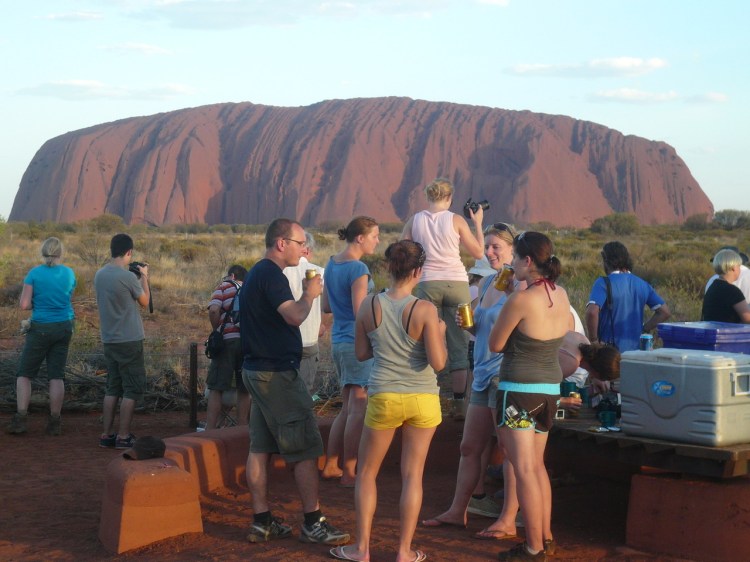 Seeing Uluru (Ayer’s Rock) in person was such a spiritual experience; I’ve never felt so in touch with the Earth’s energ… BLAH BLAH BLAH…it’s a big, red rock in the middle of nowhere, and you have about 5,000 other tourists always at your side when viewing it. That said, seeing it at person was great, and the sunset viewing was a blast; it’s essentially just a big happy hour and *everybody* in the sunset corral (they make you go to specific areas for the sunrise and sunset viewings) has a drink in their hand, as this picture kind of shows. The sunrise viewing area is a similar scene except that everybody instead has a coffee in their hand. I wanted to climb the rock (though the Aborigines ask and tell you not to), but couldn’t because the climb was closed due to high winds and temperatures – I think it got to about 43 degrees celsius that day – so had to settle for walking around the whole thing.