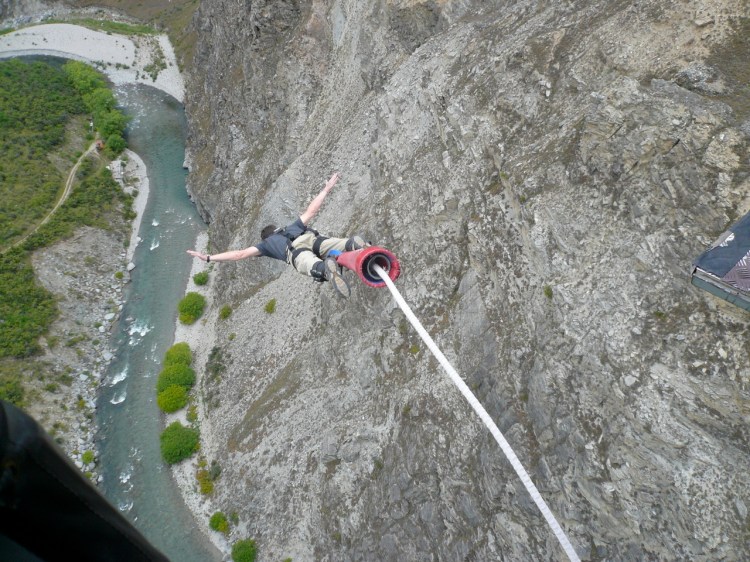 Whilst in Zambia in 2001, I bungy jumped 111 meters (364 feet) from a bridge over Victoria Falls. That seemed high then, but I remember the bungy operators being a little bummed because a bungy site had just opened up outside of Queenstown, New Zealand that was higher – 134 meters (439 feet). Thus, since I was in Queenstown, I had to do it, and it was intoxicatingly terrifying. I had no problem jumping off the platform – look at that perfect jump form in this picture! – but it’s a 8.5 second free fall and I got really scared about 6 seconds in. Alas, my quest is not over: There’s now a higher bungy site in Thailand…