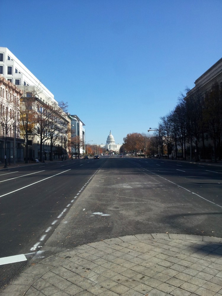 Great Thanksgiving DC scene: Ten of my Latino neighbors playing football (American) in the nearby Square, speaking Spanish the whole time, but yelling the rush count as “One Mississippi, Two Mississippi…”. Also, the empty streets.