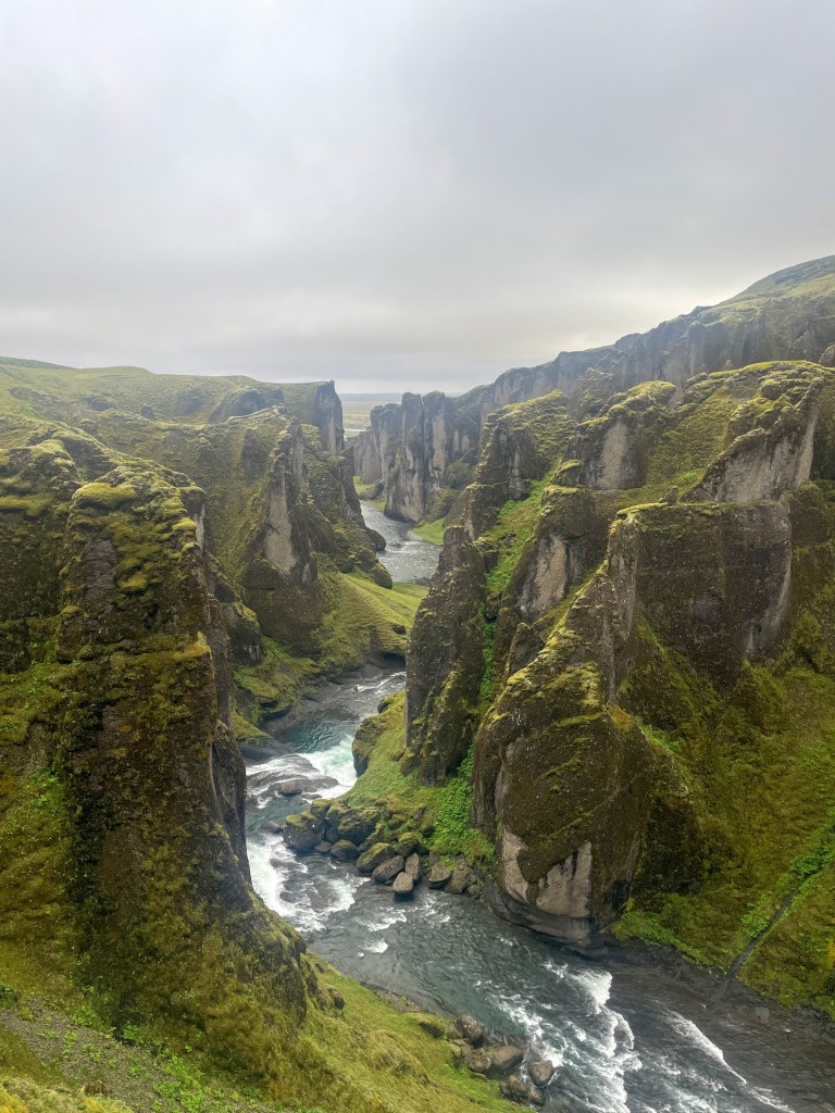 I feel like “gorges” is the only thing I haven’t mentioned when describing the amazing scenery that is Iceland. But because waterfalls = rivers = gorges, of course it has some, and Fjaðrárgljúfur (here’s how you say it) is a spectacular one, especially with all the green summer growth: