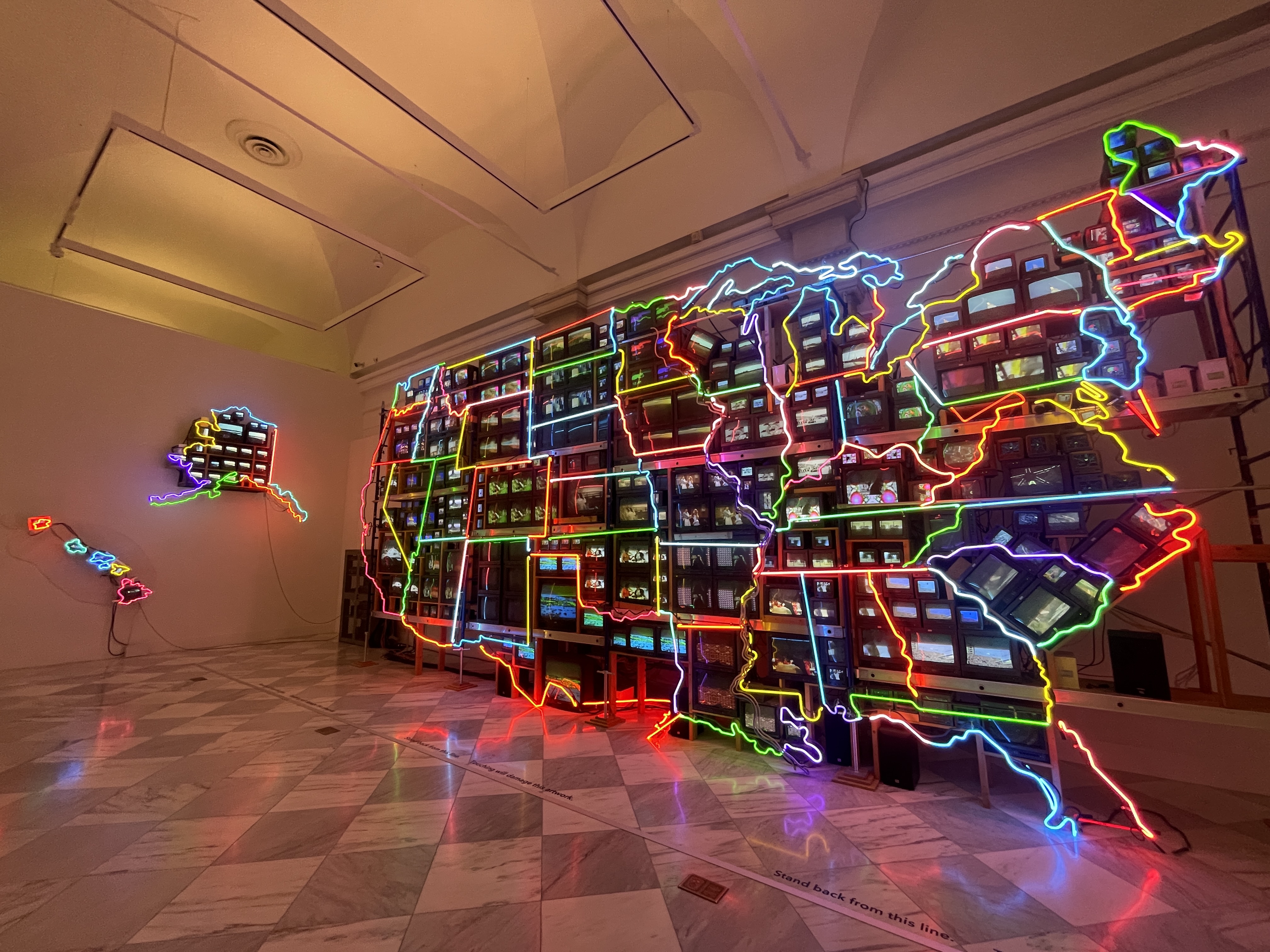 Saw this giant creation yesterday at the newly re-opened American Art Museum. The little TVs within each state played content from the state, eg. landscapes, events, famous people. And for DC, a camera in the hall captured you and showed it on a tiny little screen. Pretty cool.