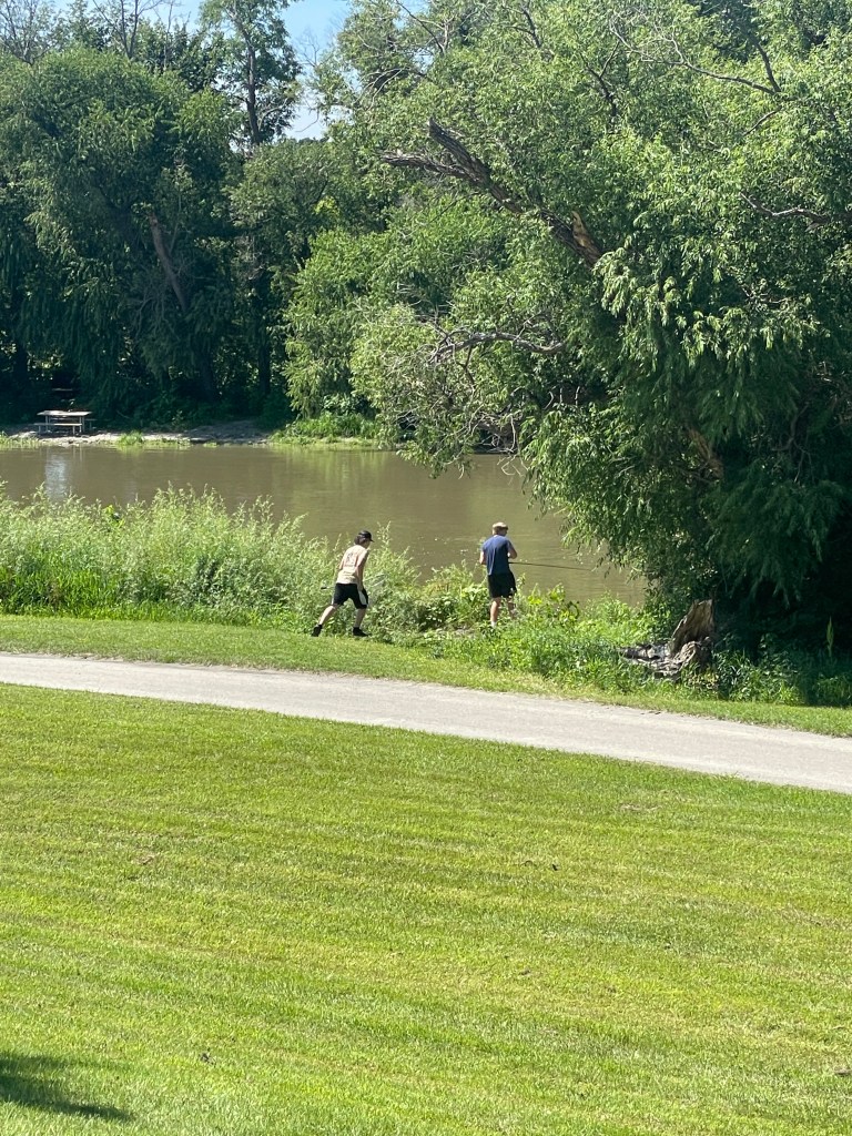 I was sitting in the shade on the hill by the river, and watched, for far too long, these two fellas catch a giant fish. They were so excited, and I was pretty proud of them: