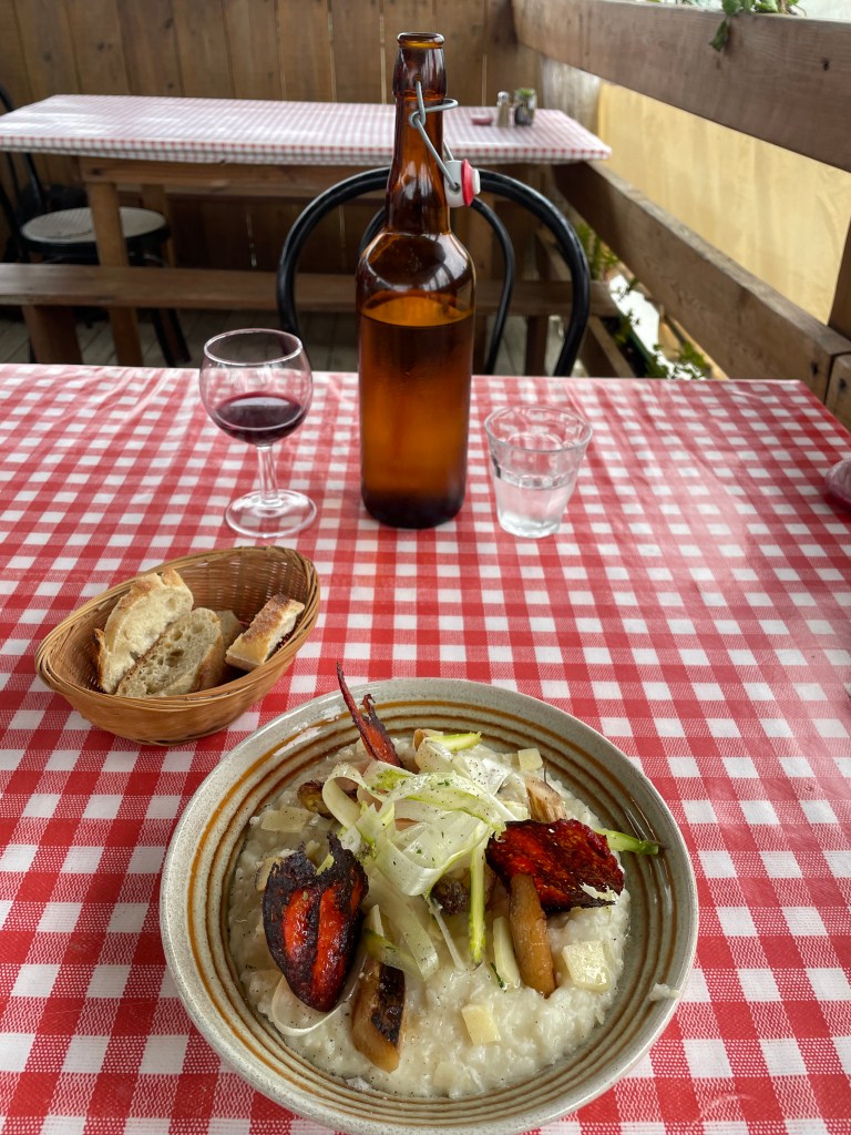 The lovely, amazing, English-speaking waitress carried the sandwich boards in for me to read from my seat. I ordered a local red wine & risotto, which was: risotto in an asparagus cream sauce; shaved fresh asparagus salad; pieces of cut asparagus; chunks of cheese; chips of grilled chorizo that was as thin & crunchy as a potato chip, yet somehow still perfectly meaty & chewy: